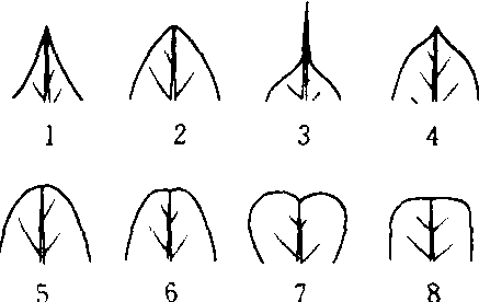 叶尖形态 1.渐尖 2.锐尖 3.尾尖 4.骤尖 5.钝尖 6.微凹 7.倒心形 8.截形 |
