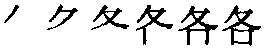 各 甲骨文〈經典作格,格至也〉; 金文; 篆gè,gě[夊(來,意符)+凵(kǎn,口,表示場所,是古人穴居在文字上的反映,各在構字上正好與“出”相反)→各(《説文》:“各,異辭也。從口夊。夊者。有行而止之,不相聽也。”各,一人從遠方走來。爲“客”本字。各:1.gè,借爲每一〈各自〉。2.gě,借爲特别;與衆不同〈脾氣各〉。)] 《詩經·鄘風·載馳》:“女子善懷,亦各有行。”(女子雖然多思慮,然而各自有主張。) [西漢] 司馬遷《史記·伯夷列傳》:“子曰:‘道不同,不相爲謀,亦各從其志也。’”(孔子説:“志向不相同,不能同走一條路,也只能各行其道了”。) 各(6画) ❶gě ❷gè