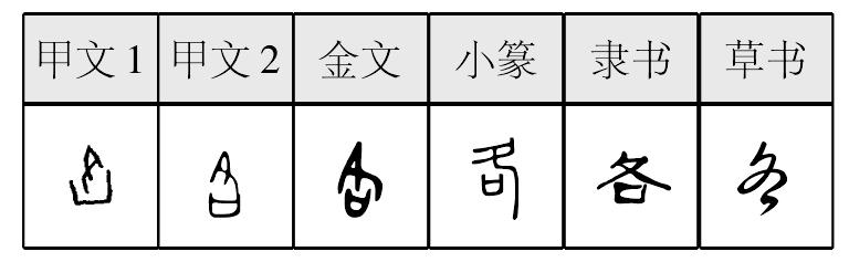 ❷ 天各一方 各各,甲骨文作  ,金文作    (摹本),小篆作 。 甲骨文从止朝向凵的方向會意, 表示由外而來、 來到。“止”即足。“凵”古同 “坎”,象坎穴之形, 後來統一作 “口”形。金文增意符 “彳”“辵”“走”表示行爲動作,其義益顯。傳世文獻多作“格”,故辭書曰:“格,至也。”提示: 由外而内曰 “各”,由内而外曰 “出”,“各”“出”二字所从之 “止”方向相反則意義相反,古人造字智慧如此。卜辭、銘文多用本義。銘文又或讀 “客”,或讀 “略”,蓋因 “客”“略”皆从各得聲。 楚簡帛文作 ,依然篆勢。秦簡牘文作 ,已近今體。參見046.出字條。 各gè甲骨文为会意字,上为“夂”(zhì,致,到也),代表脚;下为“口”,表示住所。意为有人从外面向住所走来。本义已消失,只有“客人”的“客”尚有若干本义的信息。作形容词、副词有时读作去声。作声符生成的字有: ge 阴平:胳(胳膊) 咯(象声词) 袼(袼褙) 阳平:阁(楼阁) 搁(搁不住) 格(合格) 骼(骨骼) 去声:铬(金属元素) 硌(凸起的硬东西跟身体接触,使身体感到难受或受到损伤,如“硌脚”) kè 客(宾客) 恪(恪守) hé 貉(一丘之貉;另读háo) é 额(定额) ka 阴平:喀(喀什,地名,在新疆) 上声:咯(咯血)
