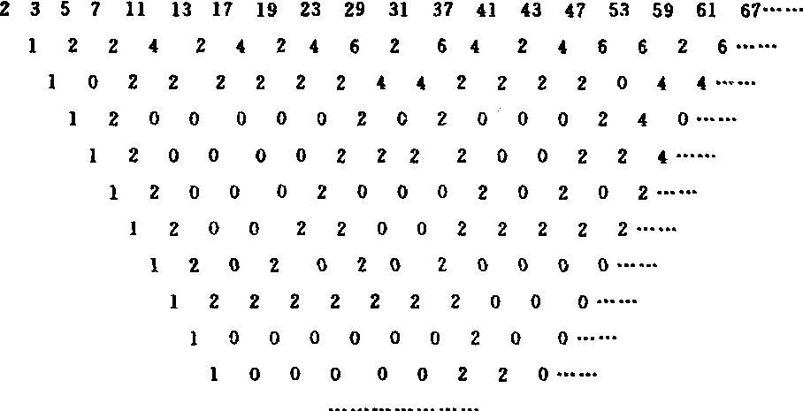 1958年,美国数学家吉尔布瑞斯(N. L. Gilbreath)发现: 如果把全部素数按照由小到大的顺序写成一行, 并在任何相邻两数中用大的减去小的,得到第二行数。对第二行中任何相邻两数, 仍用大的减去小的, 得到第三行数, 依此类推: