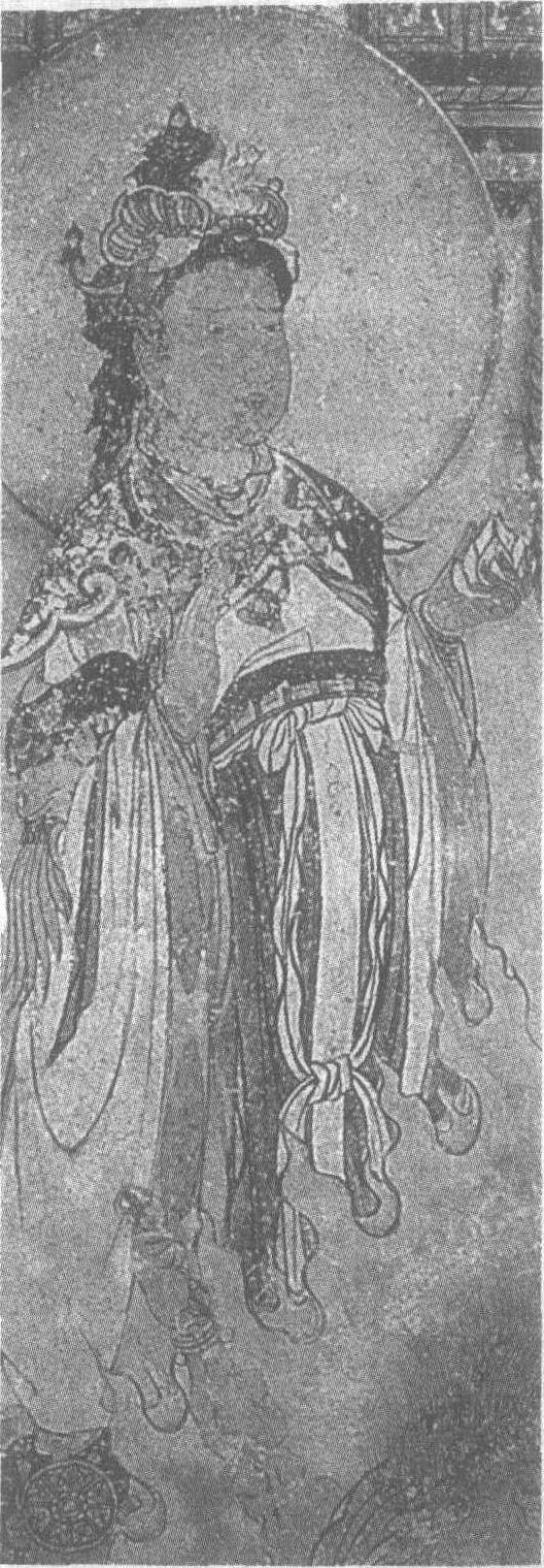 | 释义 | 吉祥天图壁画 吉祥天图壁画元。甘肃省敦煌县莫高窟第3窟北壁西侧壁画。吉祥天又名辩才天,功德大,是帝释天之女,多闻天之妃,聪慧有辩才,善歌詠,司国家安泰及个人福德。图中吉祥天梳高髻,戴花冠,着云肩羽袖大带裙襦。左手捧莲花,右手扬起作施与状。她的面庞丰圆,五官精巧秀丽,双眉紧锁,凝视前方,一副若有所思的神态,俨然是一位端庄、聪颖女子形象。人物轮廓线条圆润,衣纹舒展自然,具有飘垂的质感,是一幅优秀的人物肖像画。