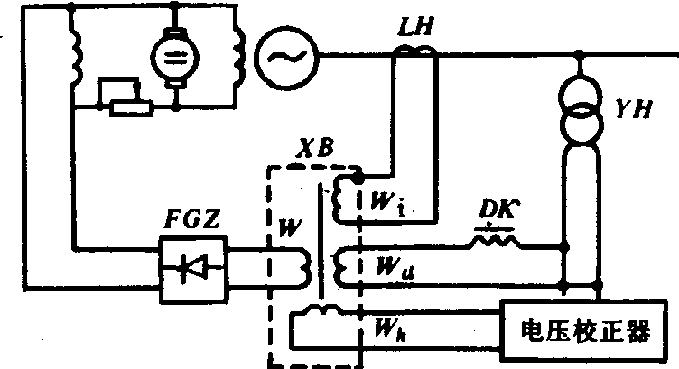 | 释义 | 同步发电机的相位复式励磁装置apparatus of phase compound exciting for synchronous补偿同步发电机因负荷电流的幅值及其功率因数的变化,所引起的电枢反应,以改善发电机电压质量的一种复式励磁装置。装置的原理如图1所示,图中XB为相复励变压器,其输出经整流器FGZ整流后,送到励磁机的励磁绕组,XB原边的两绕组Wi及Wu,电流绕组Wi接发电机电流互感器LH,电压绕组Wu经电抗DK,接发电机电压互感器YH,于是取得电流、电压两个信号。