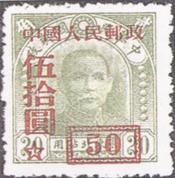 发行日期:1950年6月9日起 齿孔度数:14 印刷版别:胶版 图幅: 加盖全张枚数:50(10×5) 加盖:北京人民印刷厂  孙中山像              (一)“中央一版”加字改值(1950年6月9日) (1)50元(红)/2角(黄绿)(1950年7月6日) (2)50元(红)/2角5分(褐棕)(1950年7月6日) (3)50元(黑)/5角(桔红) (4)100元(红)/2元5角(蓝) (5)100元(黑)/3元(棕) (6)100元(黑)/5元(深绿) (二)“中央二版”加字改值(1950年7月6日) (7)100元(蓝)/4元(棕) a.“中央一版”加盖 (8)100元(蓝)/10元(玫红) a.“中央一版”加盖 (9)400元(蓝)/20元(橄绿) a.“中央一版”加盖 (10)400元(蓝)/44元(红) (11)400元(红)/65元(黄绿) (12)400元(红)/100元(绿) (13)400元(黑)/200元(红棕) (14)400元(红)/300元(浅蓝) (1)-(14) 14枚全 |