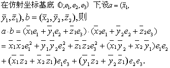 这表明,a · b是a和b的坐标的齐二次式,任意一个关于 的齐二次式都可以看作是两个向量在某一仿射坐标基底下的内积. 并且,当仿射坐标基底取得最好 (正交) 时,相应的齐二次式最简单.❺ 两向量的向量积的坐标表示