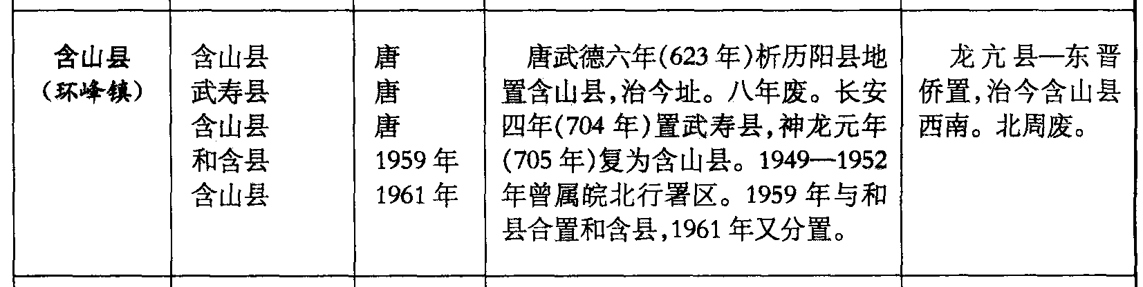 含山县(环峰镇)含山县武寿县含山县和含县含山县唐唐唐1959年1961年唐武德六年(623年)析历阳县地置含山县,治今址。八年废。长安四年(704年)置武寿县,神龙元年(705年)复为含山县。1949—1952年曾属皖北行署区。1959年与和县合置和含县,1961年又分置。龙亢县—东晋侨置,治今含山县西南。北周废。