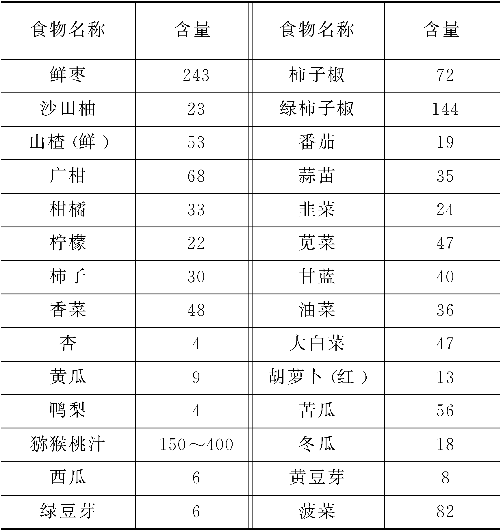 维生素C又称抗坏血酸。供给量成人每人每天为60 mg,孕妇为80 mg,乳母为100 mg。广泛存在于新鲜蔬菜和水果中。含维生素C较丰富的食物见下表(以100g计,单位:mg):