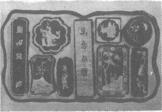 清。墨箱高35厘米,长27厘米,盒高4.3厘米,长24厘米,宽14厘米。上海博物馆藏。集锦墨是一种带有装饰性的成套丛墨,饰以金银彩绘,造成各种样式,作为宫廷品赏和文人间相互馈赠的礼品,盛行于明、清。吴天章造的这套集锦墨共有49锭,分别用五只墨盒合装于一墨箱。集锦墨造型多样,有的仿古代玉器圭、璋、璧、环,有的仿古代钟形、琴形、龙柱形、古钱形,仿动物的燕子、麒麟、云鹤、松鹿,还有八卦、海屋添寿、灵芝等。墨质地密,坚如玉,纹如犀,上饰以漱金,涂填粉彩,因而显得金碧辉煌,华丽精致,雕刻精工,微小处纤毫毕呈,清晰悦目。这套集锦墨数量多,造型图案精美,保存完好,堪称稀世之珍。吴天章,名倬,字天章,生于明崇祯年间,是清代的制墨名家,特别善制集锦墨。