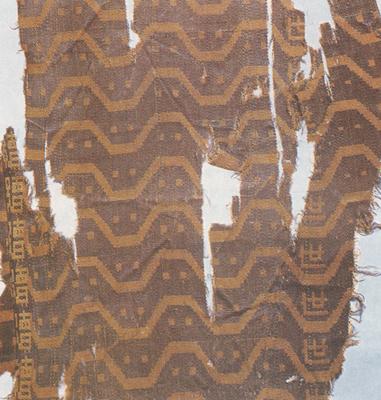◎织锦/东汉 1980年新疆罗布泊西岸楼兰故城东7公里高台墓地2号墓出土 残长26厘米 宽13厘米/新疆维吾尔自治区社会科学院考古研究所藏 ●此织锦的主体纹样为规则的折线波纹,有如山峰连绵不断,律动感极强。 波折纹间缀饰双点纹样,起到调和安静的作用。在相隔三个曲线凹形内夹织隶书“续世锦”三字;“锦”字残缺,仅见“续世”二字,取其无限延续、连绵不断之意。 深蓝色作地色,赭石色作纹样,使图案朴素高雅;纹样在明度上与地色拉开距离,使其更加醒目突出。 |