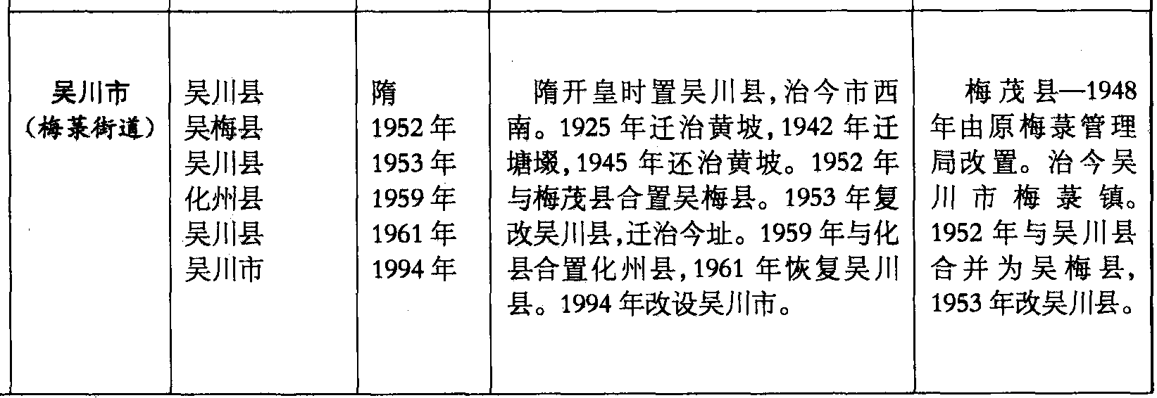 梅茂县—1948年由原梅菉管理局改置。治今吴川市梅菉镇。1952年与吴川县合并为吴梅县,1953年改吴川县。
