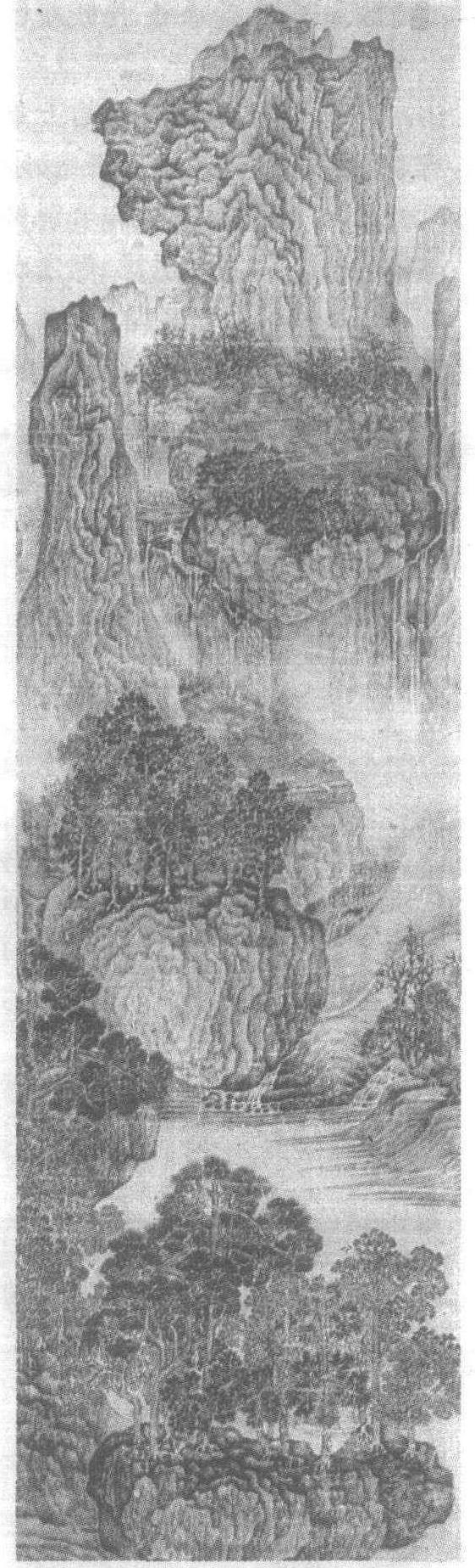 明。吴彬绘。绫本设色。纵148.1厘米,横48.7厘米。浙江省博物馆藏。吴彬(公元16—17世纪初),字文中、文仲,号枝庵发僧、枝隐庵主,福建蒲田人,流寓南京。万历间为中书舍人,历工部主事。工山水,善人物,尤擅佛像,不拘古人,自成一家,受到明神宗称赏,画入藏御府,外传甚少。传世作品有《十六应真卷》、《山阴道上图》、《层峦重嶂图》等。此图绘古木参天,巨岩嶒嶙,湖水荡荡。在通往深山的古道上,古寺相连,梵宫如林。远处奇峰连天,陡壁峥嵘,掩映在林木中成群的琼楼玉宇,富丽堂皇,庄严神圣,恍若仙境。图的右上角有篆书“岱舆图”三字。构图奇妙,设色典雅,石树水屋在作者别具一格的描绘下,苍健秀逸,超尘出俗,饶具雅趣。