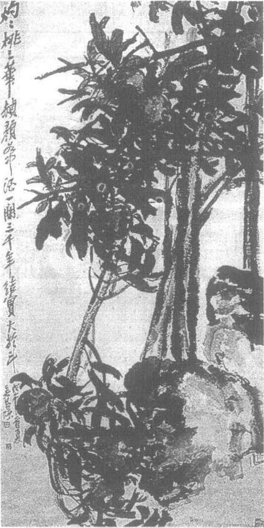 立轴,纸本,设色。又名 《桃石图》。画中顽石从右侧斜出,两棵桃干于石后平地而起,枝头从上伸展而下,几只肥硕鲜美的桃子压满枝头。桃子枝干及顽石用篆法写出,苍劲浑厚。叶子疏疏密密、偃仰复叠,极富韵律。累累硕果,用深红色大笔写出,色彩浓重艳丽,在墨色、深青色衬托下,显得汁水淋漓,鲜美可爱。画面右侧以坚劲自如的行书写下一行直款: “灼灼桃之花,頳颜如中酒,一开三千年,结实大于斗。乙卯秋吴昌硕。”其语言平实朴拙,与画意相映成趣。此图是作者大写意中的精品,其气势磅礴,笔墨挥洒自如,构图饱满,充分发挥了诗书画印结合的艺术魅力,韵味隽永。