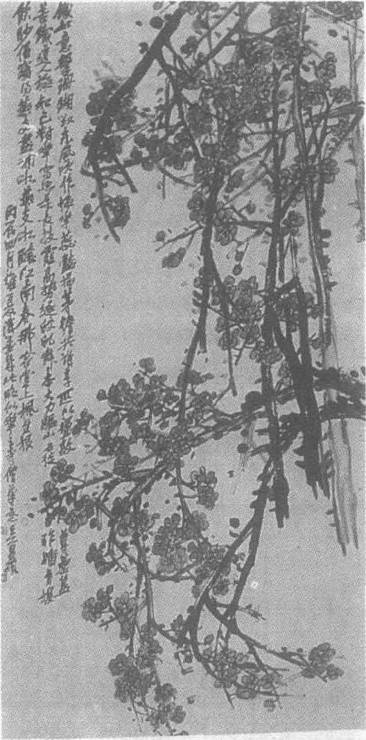 清。吴昌硕。绘。纸本设色。纵159.2厘米,横77.6厘米。上海博物馆藏。此幅绘于丙辰(公元1916年),吴昌硕72岁,此时画家已步入晚年,艺术上的卓越成就使他成为“后海派”最杰出的大家。以画家所题,画系“泼墨”而成,几条梅枝自上直贯而下,倒垂斜出,浓墨画主干,较淡的墨画旁枝,粗笔渴墨,纵横交错,层次丰富,看上去很有深度,枝干的笔法中透入了篆书的笔意。花瓣用写意法勾出,点以深浅不同的胭脂与大红,枝干雄健,花朵绚烂。画面中部自右至左倾出一枝,一破一立。画的顶部甚至画了半朵半朵的花瓣,使人想见到画面外那纵逸的老干与盛开的梅花。构图法度严谨,张弛有致,如他自己所说“奔放处要不离法度,精微处要照顾气魄”,充满了雄浑秀整,古逸苍冷之气。画面右侧的题诗书风凝练,诗、书、画相映成趣,气韵超然,正如他自己所说:“红梅、水仙、石头是我三友,静中相对,无势利心,无机械心,形迹两忘,超然尘垢之外。”画中题有“苦铁道人梅知己,对花写照是长枝”的诗句,以写梅寄情喻志。他曾在居所手植梅树30余株,朝夕与共,爱梅之心如此。正因为他对梅花的热爱与深入细微的观察,才使他笔下的梅花“秀丽如美人,孤冷如老衲,倔强如诤臣,离奇如侠,清逸如仙,寒瘦枯寂,坚贞古傲如不求闻达之匹士。”款署:“丙辰四月继夏泼墨成此,略似花之寺僧笔意,吴昌硕。”