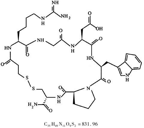 【药理作用】本品是具有抗血小板凝集作用的糖蛋白Ⅱb/Ⅲa受体拮抗剂、纤维蛋白元受体拮抗剂。本品选择性阻断粘著蛋白与糖蛋白Ⅱb/Ⅲa的结合,同时是大多数有关受体的相对弱的抑制剂。3H标记的本品同血小板难于结合,很可能是由于肽对受体显示中度亲和力,并且由完全无活性的血小板迅速分离。 狗和狒狒的血栓形成模型实验:在犬的冠状动脉损伤模型以本品平均剂量(2.85±1.8)μg/(kg· min)静脉给药时,完全抑制环流的变化。一项电击伤引起的犬动脉血栓形成模型试验中,本品 4 μg/(kg· min)可预防血管的闭合。在同样的动物模型本品4μg/(kg· min)也减少了由链激酶介导的血凝块溶解时间近 30%,并防止了犬股动脉的再闭合。当较低剂量的本品 2.5μg/(kg· min)与直接凝血酶抑制剂 hirudin 10μg/(kg· min)联合应用也观察到协同作用,减少再闭合率近 25 %。本品也被应用于犬的模型体外循环,先给犬静注 90 μg/kg,然后在低体温体外循环下 2.5h以 2μg/(kg· min)输注本品。接受本品输注的动物比对照组明显的防止血小板凝集的功能。但是本品治疗组动物也有较小的术后出血。 在狒狒的研究中,体外本品 160 nM可抑制狒狒血小板功能50 %(IC50)。在开始输注本品 2 ~ 10μg/(kg· min)15 min内,可产生体内血小板稳定的抑制,提示在体内半衰期短暂,为测定本品的抗血栓作用,给狒狒输注本品 5和 10 μg/(kg· min),用λ-闪烁照相机记录111铟-血小板堆积在股动静脉短路中涤纶血管移植物上血栓形成数。这两种剂量在75 min减少其后血栓形成分别为 24 % 和 55 % 。当此短路在本品输注后 15 min放入时,两种剂量分别减少血小板沉积约 47 % 和 80 %。测定对照动物的出血时间平均为(4.4 ±0.2) min而输注 5μg/(kg· min)组动物出血时间延长到(7.3 ±1.3) min;输注 10μg/(kg· min)的动物出血时间被延长到(11.7 ±1.2) min。 毒性:以大鼠、家兔和猴进行本品安全性评价,未发现任何意外的毒性作用。给猴静注本品7.2 mg/(kg·d)直到 28 d,未发现任何毒性。在一项更高剂量 72 mg/(kg·d),观察到挫伤过多的出血和出血点。这些作用是由于本品的强效血小板凝集抑制作用。 【药代动力学】为研究本品的药动学数据,已进行了 99例健康志愿者的研究。其血浆清除率范围在 150 ~ 300ml/(kg·h)之间;血浆半衰期范围在 0.6 ~ 1.8h之间。在轻度肾功能损伤的病人(肌酐清除率 =30 ~ 60 ml/min),本品的血浆清除率为 80 ~85ml/(kg·h)和半衰期为 2.4 h。估计这些病人的血浆清除率不断的降低,而他们的血浆半衰期继续延长。未发现本品与肝素或阿司匹林的相互作用。本品在体内通过肾和非肾的两种机制被清除。健康人在第一个24 h内大约 40 % 的药物通过肾脏清除,药物主要以原形在尿中排除(34 % ),脱酰胺的本品占 19 %,更多级的代谢占 13 % 。 【适应证】本品适用于冠脉综合征病人,且无需考虑是否有急性冠脉症状(不稳定性心绞痛和无Q波心肌梗死),以及那些有急性冠脉症状和正在使用药物治疗的病人。及行经皮冠状动脉手术(PCI)的病人。 【剂量与用法】急性冠脉综合征病人:静注本品 180 μg/kg,继以每分钟持续滴注 2μg/kg,直至病人出院或作冠状动脉搭桥手术,最长可达 72 h。 无急性冠状动脉综合征的病人,在开始作PCI前,立即静脉推注本品 135 μg/kg,继以每分钟持续滴注 0.5μg/kg,共 20 ~ 24 h。 【临床评价】在一项随机、双盲、安慰剂对照、63例健康志愿者的试验中,给予本品 0.2~ 1.5 μg/(kg· min),都能良好耐受。药物的血浆浓度与其在体内抑制血小板聚集的效果成正比。在体内迅速抑制血小板聚集作用,在停止输注本品后,很快恢复到原来的水平。一项体内试验,在输注本品速率1.0 μg/(kg· min)时显示完全抑制ADP诱导的血小板聚集而更高输注速率仅轻微延长个体的出血时间。未观察到临床出血的不良反应。本品的血浆半衰期为 50 ~ 60 min。另一项临床试验,150例接受择期经皮冠状动脉手术的病人,他们被随机分为安慰剂组和推注本品90 μg/kg +1.0 μg/(kg· min)滴注 4 h或推注 90 μg/kg+1.0μg/(kg· min)滴注 12 h。在给药 1 h后观察到体内血小板聚集 86 %被抑制。而且在滴注 4 h或 12h期间这种抑制一直被维持著。本品治疗的病人,小出血是增加的,而大出血增加未超过安慰剂组。 另一项试验,在接受择期冠状动脉成形术的病人中进行。病人被随机分为安慰剂组(n =19)或本品组(共 54 例,按剂量分为180 μg/kg推注 +1.0μg/(kg· min)滴注;135 μg/kg推注 +0.75μg/(kg· min)滴注或 0.5μg/(kg· min)滴注;和推注 90 μg/kg+0.75 μg/(kg· min)滴注 18~ 24 h,同时并用阿司匹林和肝素。两个最高本品组在输注本品 15 min后,75 % 以上的病人,对 ADP诱导的血小板聚集,提供了 80 %以上的抑制。连续输注则本品0.75 μg/(kg· min),维持稳定的血小板聚集抑制 18 ~ 24h,当停止输注迅速恢复,4 ~ 6h血小板聚集接近对照值。用本品治疗的病人未见出血的不良反应增加。 在一项临床试验中,4010例接受择期的或急诊紧急冠状动脉手术。病人被分为 3个组:安慰剂组(n = 1 328);推注本品 135μg/kg+0.5 μg/(kg· min)滴注 20 ~ 24 h(n =1 349)或推注本品135μg/kg+0.75 μg/(kg· min)滴注(n =1333)。这项研究的主要终点测定是 30d发生的死亡、心梗、诊手术或重复经皮血管重建,或因突然闭合冠状动脉需要处置的事件。主要的安全性是大出血和小出血。通过分析,本品135 μg/kg+0.5 μg/(kg· min)组产生的终点事件明显减少(11.6 % 对9.1?牐琍 =0.035)而 135μg/kg+0.75μg/(kg· min)组也减少终