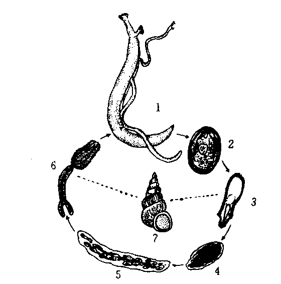 生活史 日本血吸虫及其生活史 (方姚永政等) 日本血吸虫及生活史1. 成虫 (雌雄合抱) 2. 卵 3.毛蚴 4.第一代胞蚴 5.第二代胞蚴6. 尾蚴 7. 钉螺 日本血吸虫,成虫寄生于人体肠系膜静脉内, 雌雄异体,体长10—30毫米, 体宽0.3—0.5毫米, 雌雄虫合抱共同生活, 寿命可达10—20年。中间寄主为钉螺,感染期为尾蚴,当人赤足在疫区劳作时,尾蚴即钻入皮肤,随血液在体内移行,经门静脉发育为成虫。虫卵为主要的致病因素。患血吸虫病,先是肝脾肿大、发热、便血和消瘦等急性期症状,而后转入慢性期,大量虫卵不断在肝脏及肠壁沉积引起脓肿并纤维化,出现肝硬化、巨脾和腹水等症,以至丧失生育及劳动能力,儿童则发育受阻形成侏儒症,重者可引起死亡。血吸虫病在我国长江流域及其以南地区流行。 布氏姜片虫,为体内最大的一种寄生吸虫,长可达75毫米,宽可达30毫米。成虫寄生于人的小肠内,中间寄主为扁卷螺,感染期为附着在菱角、荸荠和茭白等水生植物上的囊蚴。当人生食未洗净的上述被寄生虫污染的水生蔬菜时,可感染。虫体在肠腔内发育,成虫寿命一年。患者的主要症状是腹痛,腹泻,重者发生浮肿、腹水,青少年患者则影响发育。 肺吸虫(卫氏并殖吸虫),成虫体表具棘,寄生于人肺,长8—16毫米,宽4—8毫米。第一中间寄主为川卷螺,感染期囊蚴寄生在第二中间寄主溪蟹、蝲蛄等的肌肉和内脏等处。人生食被肺吸虫囊蚴寄生的溪蟹和蝲蛄时可被感染,童虫穿过肠壁进入腹腔,再穿过横隔膜进入胸腔,成虫寿命6—20年。患者症状似肺结核:痰中带血,乏力、低热和胸痛等。童虫和成虫移行能力强,常异位寄生,如脑内寄生可引起癫痫和半身不遂等症,淋巴系统寄生可引起淋巴结肿大,皮下或肌肉寄生出现有压痛感的结节。肺吸虫的终末寄主除人外,还有虎、狼和狗等。我国肺吸虫的疫区为南方及东北地区。对吸虫病要采取预防为主的方针,如消灭中间寄主,注意饮食卫生(生熟菜不要混切、饭前便后洗手等),改变饮食习惯(不吃生的或半生的鱼、虾和蟹等),加强粪便管理,注意家养动物的卫生和管理。 ☚ 涡虫 轮虫 ☛ |