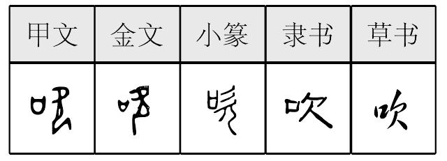 ❹凤吟鸾吹|日炙风吹 吹chuī会意字,甲骨文右边为人呵气的样子。作声符省去“口”,生成的字有: chuī 炊(炊事员) 吹chuī(7画)