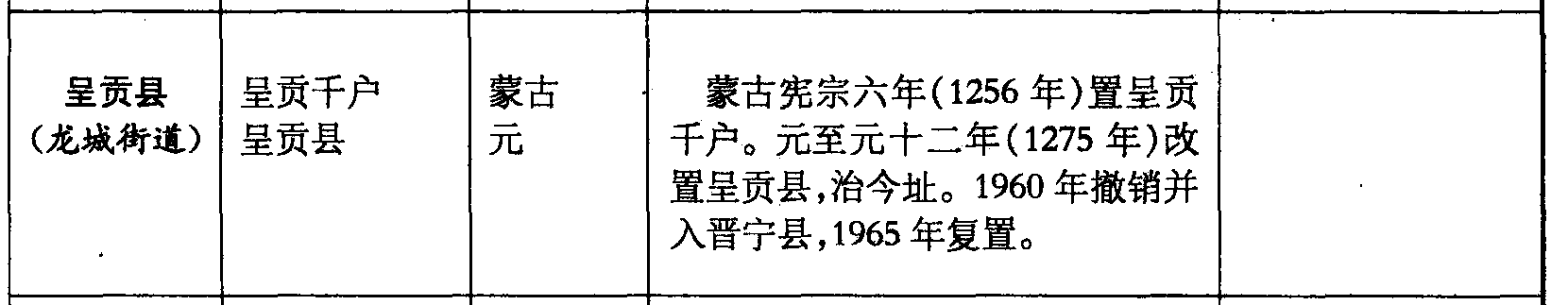 呈贡县(龙城街道)呈贡千户呈贡县蒙古元蒙古宪宗六年(1256年)置呈贡千户。元至元十二年(1275年)改置呈贡县,治今址。1960年撤销并入晋宁县,1965年复置。