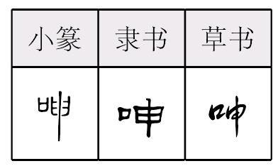 呻 金文; 篆shēn[口(意符) +申(聲符)→呻(《説文》:“呻,吟也。從口,申聲。”呻,呻吟,指人因痛苦而发出的聲音。)] 田漢 《盧溝橋·第三幕》:“病室内傷兵累累,呻吟滿耳。” 呻*shēn(8画)