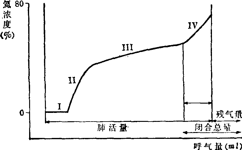 图1 正常人、哮喘、肺气肿肺顺应性线的比较 ❷气道阻力: 是反映阻塞性通气障碍的定量指标。气道阻力不仅取决于管径大小,还受到气流流速和气流形态的影响。肺组织和气道阻力测定如流速-容量曲线分析说明气道阻塞程度,也提示阻塞的部位和机理,为临床诊断、治疗和疗效考核提供参考依据。 ❸呼吸功: 是完成呼吸运动的能量消耗。呼吸功大于正常,提示呼吸运动弹性或(和)气道阻力的增加,也说明呼吸困难的客观存在,故呼吸功测定也是呼吸困难症状的客观定量指标。小气道功能测定 支气管越向下分支,其管径越细。第六代分支以下直径<2mm者称为小气道。支气管分支越多,虽每个气道管径细小,但总的横断面积却相应增大,阻力小。小气道阻力还与肺容量大小有关,在超过肺活量的2/3时,小气道几无阻力; 在肺活量10~20%时,阻力最大,但也不超过气道总阻力的20%。周围小气道占总气道阻力百分比如此少,故小气道阻力即使明显增加,对总阻力的影响极有限。因此一般通气和气道阻力测定都不能敏感地反映小气道的阻塞。近年来多采用以下三项测定检测小气道功能。 闭合气量测定 由于重力作用,直立吸气时胸腔内负压呈现自上而下负压递减的梯度,导致吸入气肺内分布在时间和数量上的区域性差异。上肺区肺泡内负压大于下肺区,故吸入气先进入上肺区,后进入下肺区; 下肺区肺泡扩张度大于上肺区,故下肺区充气量大于上肺区。深呼气时,下肺区肺泡气先呼出,继而上下肺区同时排气。接近呼气末,下肺区小气道陷闭后,其余肺区的肺泡继续呼气。小气道开始陷闭后尚能呼出的气量称为闭合气量。小气道开始陷闭时肺内留存的气量(即闭合气量与残气量之和)称为闭合总量。闭合气量测定有两种方法。1. 氦弹丸法: 利用吸入气在肺内分布存在时间差异的特点而设计。受检者深呼气后,再作深吸气。在吸入空气前段注入少量氦。由于吸气先进入上肺区,上肺区肺泡气氦浓度就高于下肺区。用函数记录仪描绘深呼气量和呼气瞬时氦浓度的关系曲线,可得如图2的典型形态。曲线可以分为四相(或四段):Ⅰ相是呼气开始段,氦浓度为零,相当于解剖死腔的容积;Ⅱ相,上下肺区肺泡气紧随死腔气呼出,氦浓度迅速上升;Ⅲ相,曲线呈相对平坦段,是上下肺泡同时呼气的氦浓度改变;Ⅳ相,氦浓度突然上升,表示下肺区小气道受胸内压挤压闭合,下肺区肺泡中止排气,而氦浓度较高的上肺区肺泡继续呼气。氦浓度开始上升至呼气完毕的Ⅳ相呼气量即为闭合气量。