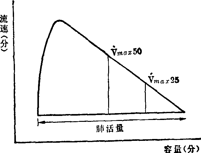 图2 闭合气量示意图 2. 氮测定法: 受检者从残气位吸入纯氧至肺总量,用函数记录仪描绘呼气量和呼气瞬时氮浓度的关系曲线。由于上肺区肺泡充氧量少于下肺区,故上肺区肺泡氮浓度高于下肺区,呼气时氮浓度也出现四相。Ⅳ相呼气量即为闭合气量。闭合气量和闭合总量受到年龄、体表面积的影响。为排除体表面积的干扰,常以闭合气量占肺活量和闭合总量占肺总量的百分数来表示。 流速-容量曲线测定 反映不同肺容量时的最大呼气流速。受检者深吸气后作用力呼气,以函数记录仪描绘出流速-容量曲线。健康人的曲线如图3。深吸气后用力呼气,胸内压挤压肺泡排出肺泡气的同时,亦挤压呼吸道,管壁较薄、内径较小的小气道首当其冲,使呼气阻力急剧增加,流速即下降。可见呼气流速不单纯取决呼气力量(胸内压)的大小,且与气道的弹性、管腔粗细及其通畅程度有关。在用力呼气前段,肺容量较大时,呼气流速与呼气力量呈正比,用力越大,流速亦越高;呼气中后段,肺容量较小,呼气流速与用力无关,而与小气道壁的管腔和管壁弹性关系较大。在肺活量的50%或25 %的最大呼气流速(Vmax50或Vmax25)反映小气道阻力最为敏感,故临床上以此为指标。 小气道功能测定的生理和临床意义: 小气道功能测定结果反映用力呼气过程中小气道闭合阻塞的倾向性,它可能是管腔内阻塞,或管壁顺应性增加或管壁外肺组织牵引力的减退。小气道测定指标的减损可能是小气道功能异常,为功能性或者是病理变化的后果。 血液气体分析和酸碱度测定 呼吸功能保证静脉血的有效动脉化。动脉血气分析是对呼吸生理的综合性考核。静脉血气情况随局部组织代谢和循环条件而变化,