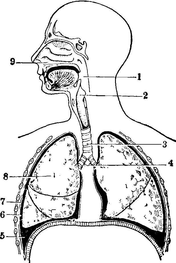 1.咽2.喉3.气管4.主支气管5.胸膜窦 6.胸膜腔 7.胸膜壁层 8.肺 9.鼻腔作用。