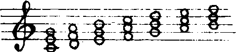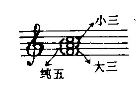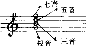 > 从根音到三音为大三度,从三音到五音为小三度,从根音到五音为纯五度的三和弦,叫做“大三和弦”。 从根音到三音为小三度,从三音到五音为大三度,从根音到五音为纯五度的三和弦叫做“小三和弦”。 从根音到三音和从三音到五音都是大三度,从根音到五音为增五度的三和弦叫做“增三和弦”。 从根音到三音和从三音到五音都是小三度,从根音到五音为减五度的三和弦叫做“减三和弦”。 按照三度音程关系叠置起来的四个音构成的和弦,由于从根音到第四音是七度音程,所以叫做“七和弦”。七和弦中四个音的名称见下图: