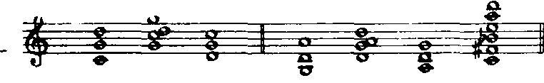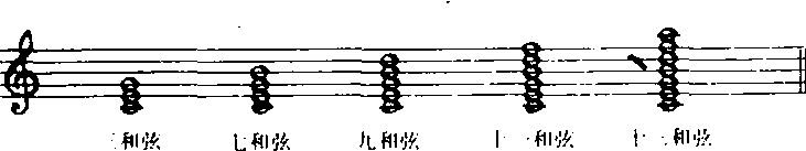 另一种非三度结构的和弦是在三和弦上附加二度音或六度音。附加音只是和弦的填充,只造成一种特殊的色彩。附加音和弦形似某些和弦的转位,但其性质却迥然不同。如: