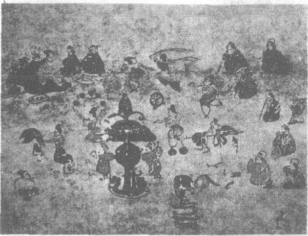 和林格尔汉墓壁画 (局部) ☚ 营城子汉墓壁画 高句丽墓壁画 ☛ 和林格尔汉墓壁画 和林格尔汉墓壁画位于新店子小板申村东,西北距县城40公里。墓主为东汉末年管理北方乌桓、鲜卑、羌等少数民族事务的护乌桓校尉。墓表封土约高2米,墓室为穹庐顶多室砖墓,全长约20米。墓道、墓门、甬道、前室、中室、后室及三个耳室,共占地百余平方米,绘有50多组彩绘壁画,是自治区内迄今所见图幅与榜题最多的汉代壁画。皇帝褒奖、庆功筵宴、车马出行、城垣官衙、坞堡庄园等壁画场景,描绘出墓主一生的荣耀富贵,为汉代政治、经济、军事与文化等方面的研究,提供了宝贵资料。其面法,大量运用单线平涂法,兼用白描、没骨法。《牧马图》最见功力,六匹牧马、三匹马驹皆矫健神气,栩栩如生,连马鬃毛的飘逸感也跃然画面。 ☚ 4. 和林格尔县 唐单于都护府城遗址 ☛ |