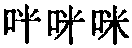 | 释义 | 咪Mī《中国姓氏辞典》据报纸报道收载并注此音。一音mí,亦姓。未详其他。 咪Mié现行傣族“姓氏”。今云南之孟连有分布。汉意为当母亲的意思。傣族成年女子婚后有了子女,其名字亦随之而改,结构有三: 首字为 “咪”; 次看第一个孩子的性别,若是男孩,则第二字称 “岩” (长子之意),若为女儿,则第二字为 “叶”、“月” (音yě,长女之意),第三是孩子名,全名为 “咪叶 (月) ×”或“咪岩×”,意思是: “长子 (女) ×的母亲”。有人以汉族姓名构造习惯分析确认 “咪叶×”、“咪岩×”、“咪月×” 等,遂以 “咪” 为姓。 咪读音m·i(-),为i韵目,属i—er韵部。 上一条: 盭 下一条: 眯 咪1mi1(动)双唇闭拢,留一条窄缝慢慢吸(液体的东西):有时,她还打半斤老酒来,让爸爸~一~。(川文82.9.14) 咪2mi1(形)作动词补语,表示程度深:麻幺婶的心头也欢喜~罗。(曲苑总2.140) 〗、阳江〖 〗。 〗。 〗。 〗。 〗。 〗。 〗、阳江〖 〗。 〗。 〗。 〗。 〗。 〗。 〗。 〗。 〗。 〗、佛山〖 〗、南海沙头〖 〗、顺德大良〖 〗、三水西南〖 〗、中山石岐〖 〗、珠海前山〖 〗、鹤山雅瑶〖 〗。 〗。 〗。![]() ![]() 咪mī咪○~~(象声词,形容猫叫的声音)。 咪mī咪咪,猫叫的声音。 咪*miDFE4 鸣叫声 鸣叫声小动物的叫声:吱(吱吱) ☚ 动物声 虫叫声 ☛ 咪mīⅠ (形容猫叫的声音) mew; miaow Ⅱ (笑咪咪) smilingly 咪*mī(9画) *咪mī9画 口部 【咪咪】 拟声词。形容猫叫声。 *咪mǐ一级 9画 口部 【咪唑(zuò)】 [英imidazole] 有机化合物。分子式C3H4N2。棱柱状结晶,可用于制药。 咪mī约宋代以前当咩(miē)的异体字。羊鸣义。现代多用作猫叫声或人唤猫声。又指微笑的样子。如:笑咪咪(现一般写作“笑眯眯”)。 咪★常◎常形声,从口,米声,本义读mī,拟声词,羊叫声(与“咩”同),引申为猫叫声;又读mǐ,假借为译音字。 |