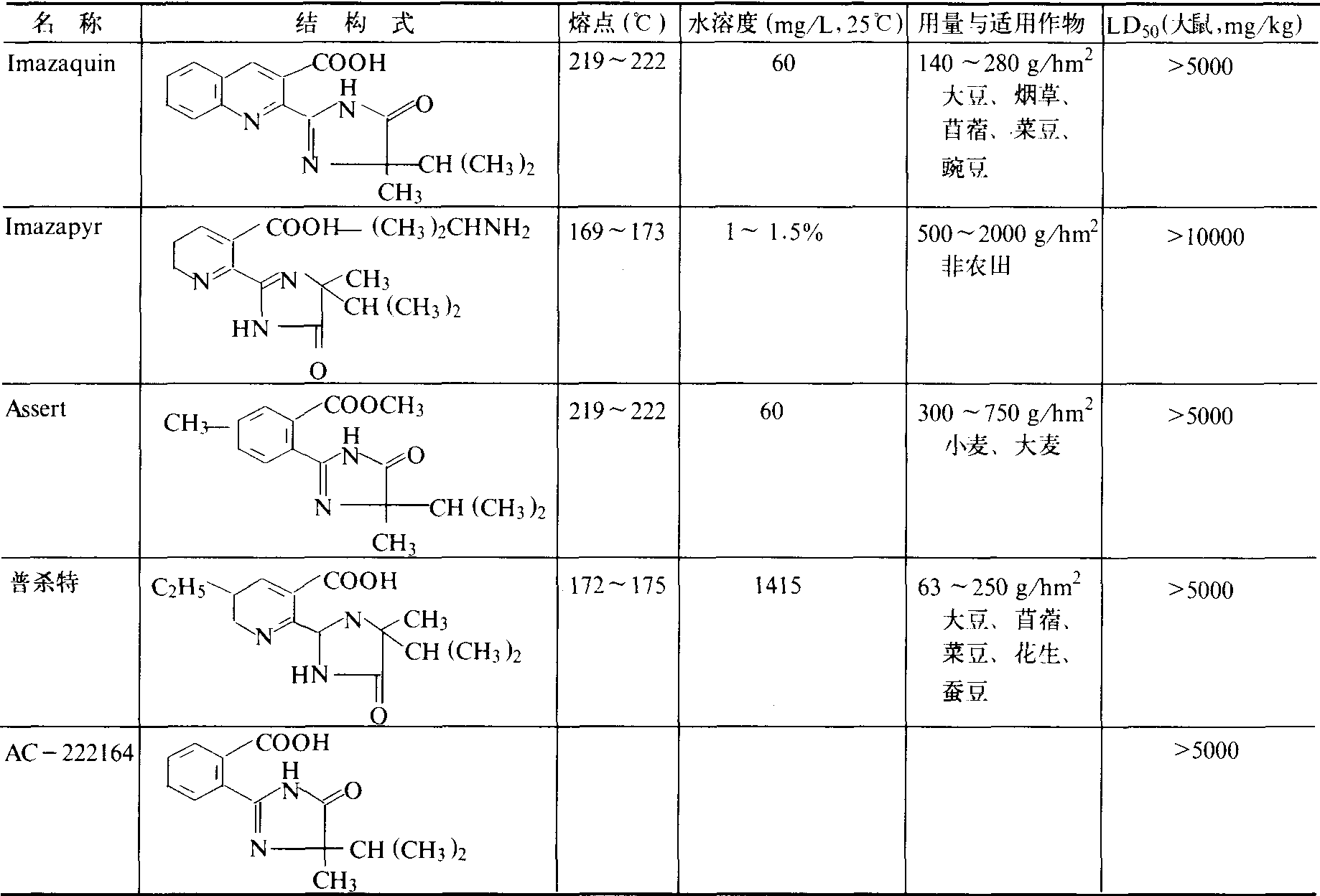 简史 咪唑啉酮类化合物的合成与筛选开始于1975年。首先发现苯邻二甲酰亚胺具有除草活性,在此基础上,合成出一系列苯环取代的衍生物,从中发现具有植物生长调节活性的AC-94377;在此类化合物的多次合成分离过程中发现了具有除草活性的化合物从而为咪唑啉酮除草剂的开发奠定了基础。1982年劳斯(M.Los)等第一次报道了此类除草剂,1983年奥尔维克(P.L.Orwick)等报道了AC-252925及席尼尔(D.L.Shaner)等报道了AC-252214,从而使咪唑啉酮类化合物成为开发除草剂新品种的活跃领域。 品种与特性 咪唑啉酮除草剂的结构特点是:❶咪唑啉酮环; ❷咪唑啉酮环上含一个甲基与异丙基; ❸咪唑啉酮环与邻位含一个羧基的芳环相连。根据上述特点,现已开发出用途各异的品种(见表)。 咪 唑 啉 酮 除 草 剂 主 要 品 种