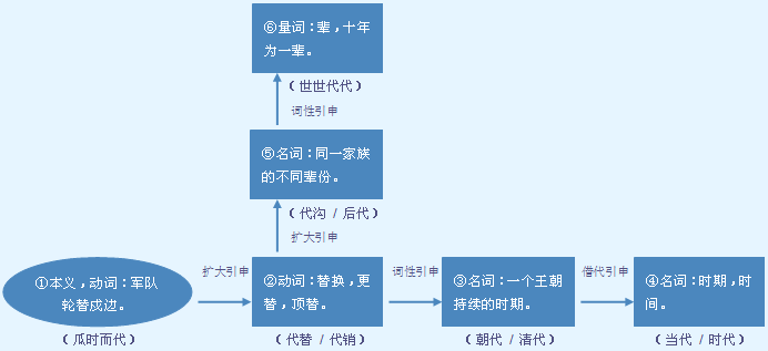 | 释义 | ![]() 量 世系的辈分。 【例句】目前青年一~与老一~的代沟问题是一个热门话题。 【同义】辈 【辨析】“代”指同一时代的同一辈人,具有庄重色彩,多用于比较严肃的场合或较大的场面;“辈”比较通俗,多用于一般的场合,它还能计量人的辈分。 代替,代理。 a.作带宾、带补谓语,或构成连动词组作谓语。 张老师给我们~了两节课|以竹~木|李~桃僵|历史课我~过两个月|我在小学~过一年数学课|本店~收废酒瓶|~售邮票|~办托运|~为办理|由他~行局长权力|连里的日常工作由一排长暂~|我的课只好请你来~了。 b.作定语,不带“的”。 国务院~总理。 表示对象。相当于“给”“替”“为”。构成介宾词组作动词的状语。 家长不应该~子女做作业|她常常~我们缝补衣服。 世系的辈分。常和数量词结合在一起使用,可以重叠。 a.作宾语。 我们要爱护下一~|他攻击我们是堕落的一~。 b.构成复指词组或数量词组作主语。 祖孙三~同住一室|我们这一~任重道远|子孙万~受益无穷|一~不如一代。 c.构成词组作定语。 这一~年轻人|下一~人|这是关系到子孙后~的大事。 d.作状语。 让两国人民的友谊~~相传|优良传统要一~一~地传下去。 【辨】 有的书把“三代人”中的“代”看作名词。但名词一般不直接同数词组合,而且有“四代、五代……”等说法,所以把这种“代”归入量词似乎更为合理。 【词语】 代办 代笔 代表 代步 代偿 代词 代号 代价 代金 代劳 代理 代理人 代庖 代数 代替 代谢 代序 代言人 代议制 代用 代用品 字源解说 弋,既是声旁也是形旁,表示系绳、可循环利用的箭。代,篆文 附 文言版《説文解字》:代,更也。从人弋聲。 附 白话版《说文解字》:代,更替。字形采用“人”作边旁,“弋”作声旁。 引申线索 ![]() 【字族索引】 弋 代 【同音字】 dài |