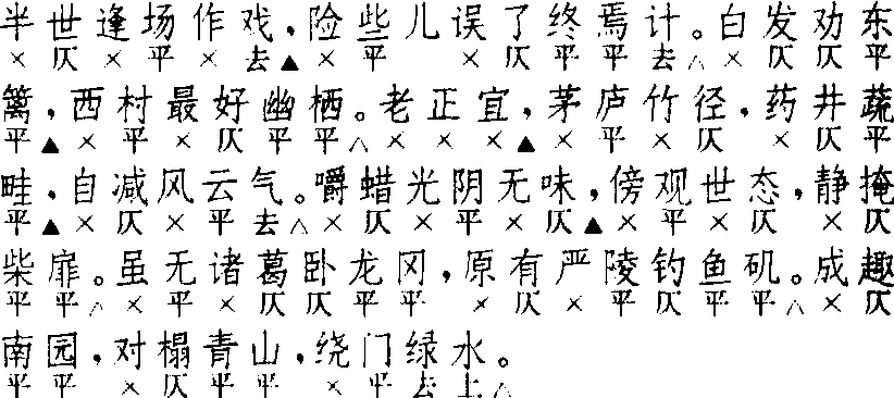 | 释义 | 哨遍 哨遍词牌名。又名《稍遍》。始见于苏轼《东坡词》。双调二百零三字,上阕五平韵四仄韵,下阕五平韵八仄韵。然其体近似散文,句读平仄往往不拘。又曲牌名。南北曲均入般涉调,字句格律与词牌异。参见“常用曲谱”类。 ☚ 宝鼎现 戚氏 ☛ 哨遍 哨遍马致远 散套 ![]() 全曲十六句:6▲,7△。5▲,7△。3▲,4,4▲,5△。6▲,4,4△。7,7△。4,4,4△。第三句可作七字句,或六字折腰句。第四句多作上三下四式七字句。第六、七句对。第十、十 一句对。第十二、十三句对。末三句鼎足对,或只对两句。睢景臣《高祖还乡》套,减第九、十、十一句,仅见。石君宝《紫云亭》第八句不叶韵,改在第九句叶韵断句。散套首牌,剧套联入套内。有幺篇换头,剧套不用,散套可用可不用。亦入〔正宫〕、〔中吕〕,只用在剧套中。与词牌小异。同诸宫调。南〔般涉调〕慢词用宋词。 ☚ 般涉调 耍孩儿 ☛ 哨遍 哨遍或作《稍遍》。见宋苏轼《东坡乐府》。其小序云“乃取《归去来辞》,稍加檃括,使就声律”,是为苏轼所创。汲古阁本《东坡词》于《稍遍》后附小注:“其词盖世所谓‘般瞻’之《稍遍》也。‘般瞻’,龟兹语也,华言为五声,盖羽声也,于五音之次为第五。今世作‘般涉’,误矣。《稍遍》三叠,每叠加促字,当为‘稍’,读去声。世作‘哨’,或作‘涉’,皆非是。”然各本仍多作《哨遍》。《词律》卷二○、《词谱》卷三九皆以苏轼所作(为米折腰)为正体,双调,二百零三字,上片十七句五仄韵四平韵,下片二十句五平韵七仄韵,同部参差错叶。《词律》云“此调长而多讹”,《词谱》云“其体颇近散文”。《词谱》列别体八种,其中《花草粹编》无名氏所作仅一百六十字,馀皆略有参差,用韵、句法或句读有异,汪莘一首平仄各韵,不用三声叶。 ☚ 晕眉山 唤春愁 ☛ 哨遍 哨遍词牌名。一作稍遍。苏轼创制。双调。苏轼《哨遍》词序:“陶渊明赋《归去来》,有其词而无其声,余既治东坡,筑雪堂于上,人人俱笑其陋,独鄱阳董毅夫过而悦之,有卜邻之意。乃取《归去来辞》稍加隐栝,使就声律,以遗毅夫。使家僮歌之,时相从于东坡,释耒而和之,扣牛角而为之节,不亦乐乎?”见苏轼《东坡乐府》。 ☚ 夜半乐 莺啼序 ☛ 哨遍 哨遍词牌名。一作《稍遍》。苏轼创制。双调。苏轼《哨遍》词序:“陶渊明赋《归去来》,有其词而无其声,余既治东坡,筑雪堂于上,人人俱笑其陋,独鄱阳董毅夫过而悦之,有卜邻之意。乃取《归去来辞》稍加隐栝,使就声律,以遗毅夫。使家僮歌之,时相从于东坡,释来而和之,扣牛角而为之节,不亦乐乎?”见苏轼《东坡乐府》。 ☚ 西河 解连环 ☛ |