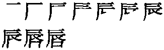 【提示】唇,半包围结构,“辰” 第二笔撇拉长将“口” 围在内; 旧字形是上下结构。辰,第五笔是一竖提,不是一竖、一提两笔。