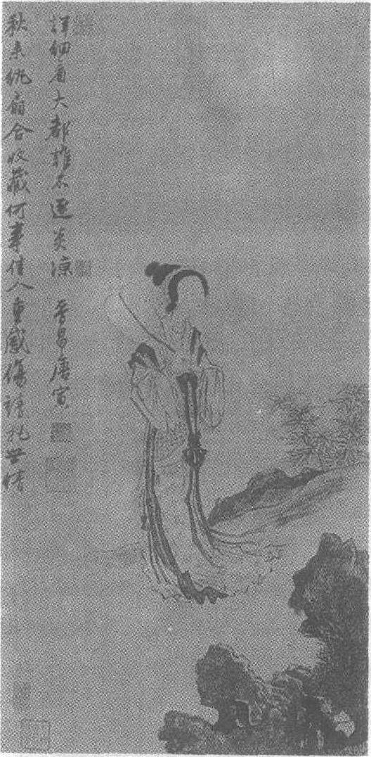 明。唐寅(见《唐寅湖山一览图轴》条目)绘。纸本墨笔。纵77.1厘米,横39.3厘米。上海博物馆藏。此图画一仕女,手持纨扇伫立于庭院中,容貌秀丽,双眸凝视前方,一副若有所思的神态。高耸的发髻,青丝如墨。背景简括,画坡石一角和疏落的细竹。左上角题诗:“秋来纨扇合收藏,何事佳人重感伤,请把世情详细看,大都谁不逐炎凉。”诗画互相映衬,表现了仕女从一柄夏天始用,秋天收藏的小小纨扇,联想到自己也与这纨扇命运一样。青春难驻,世态炎凉,禁不住惆怅伤感。突出了“秋风见弃,触目伤情”的主题。此图充满了作者对弱小者的同情。全画用白描法,墨色浓淡适宜,笔墨流动奔放,挥洒自如,极富韵律感。衣纹转笔方劲,线描遒劲飞舞,衣服线条起伏很大,点出“秋风”之意。