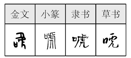 戰國文字多作 “虎”上 “口”下構造。善鼎 “唬歬(前)文人”,讀爲 “效”,效仿。出土文獻中多讀爲 “乎”,作虚詞。