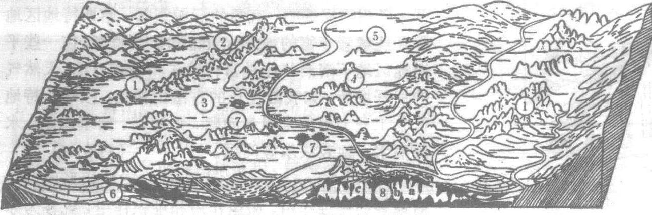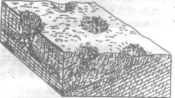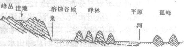 喀斯特地貌可分为地表和地下两种基本类型。常见的地表喀斯特地貌有:溶沟、石芽、石林、落水洞、漏斗、溶蚀洼地、喀斯特盆地、干谷、盲谷、峰丛、峰林和孤峰等不同形态。在温暖湿润的气候条件下,地表水沿着石灰岩地面流动,顺着节理、裂隙进行溶蚀,形成宽浅不一的溶蚀沟槽,称为溶沟(图1)。溶沟一般宽可从十几厘米到几米,深可达1米以上,长度不等,溶沟之间突起的脊、柱称为石芽(图1)。石芽的高度不等,可从数十厘米到数米。石芽除露出地面的,还有埋在地下的,是由地下水在下渗过程中溶蚀而成。发育在厚层石灰岩中的高大石芽,其间有平行的垂直溶沟、沟深坡陡,形似森林,故名石林,如我国云南的路南石林。地表水沿着岩层裂隙垂直向下溶蚀,并有塌陷发生,成为地表水流向地下河或地下溶洞的垂直通道,称之为落水洞。按其形态特征可分为裂隙状落水洞、竖井状落水洞和漏斗状落水洞等。一般落水洞的洞口直径为7—10米左右,深度为10—30米左右,最深可达百米以上。在被溶蚀的石灰岩地表常可见到一种平面轮廓为圆形、椭圆形,直径数十米,深数米至十几米的漏斗状凹地,称为漏斗(图2)。漏斗下部常有管道通往地下,地表水沿此管道下流,如通道被粘土碎石堵塞,常积水成池。按其成因可分为溶蚀漏斗、沉陷漏斗和塌陷漏斗。漏斗是喀斯特发育初期的产物,它是喀斯特地下水垂直循环作用的结果,所以漏斗多分布在喀斯特地貌高原面上。例如宜昌的山地平面上,漏斗很发育,落水洞和溶蚀洼等负地形也很多,平均每平方公里达30多个。漏斗再进一步溶蚀扩大就成为溶蚀洼地(图3、4)。溶蚀洼地底部如果被红土和其它风化物覆盖,其底部的漏斗、落水洞等流水通道被堵,积水成为喀斯特湖。溶蚀洼地底部平坦,其直径超过百米,甚至可达1—2公里。溶蚀洼地进一步扩展形成宽坦的盆地,宽度可达数百米至数公里,长度达几十公里,称为喀斯特盆地。南斯拉夫学者J.司威治最早称这种地形为坡立谷(polje),原意为可耕种的平地,现已成国际通用术语。盆地的边坡陡峭,底部平坦,常被残留的棕黄色粘土、红色粘土及河流冲积物所覆盖。一些溶蚀残丘、孤峰、峰林常常耸立在盆地边缘或排列在河谷两侧,著名的桂林山水就是这种奇特的喀斯特景观(图4)。在石灰岩地区,河流常沿裂隙、孔洞下渗,使河床无水而成为干谷。有时河流从某一陡坎的洞中涌出,从地下流出地面,然后流一段之后又从落水洞流入地下,这种上下游封闭的河谷称为盲谷,河流转入地下称为伏流,如贵阳市西南红水河支流涟水,在地表时隐时现,出现多次伏流。在喀斯特盆地的边缘广泛发育着峰林地貌,主要由峰丛,峰林、孤峰和溶丘组成,它们多发育在岩性较纯、厚度较大并多节理、断层的地区。峰丛主要发育在碳酸岩山地或高原边缘地区,其特点是基座相连,山峰陡峭,是峰林地貌发育的早期阶段。当喀斯特地貌进一步发展,则形成基座分离的陡峭山峰,远望如林,称为峰林,我国广西的桂林、阳朔等地为典型代表。喀斯特发育的晚期阶段,是多数峰林已被溶成残丘平地,只有少数较高山峰零星孤立地耸立在平原之中,称为孤峰,相对高度可达50—100米,如桂林的独秀峰、伏波岩等。在石灰岩地区,地表以下的喀斯特地貌形态十分复杂,主要包括溶洞和地下河。地下水沿着可溶性岩层层面、节理和断层裂隙等进行溶蚀形成的地下洞室叫做溶洞。地下水在岩层中顺着细窄的缝隙流动缓慢,溶蚀很慢,随着裂隙扩大,地下水循环流动加速,不仅溶蚀作用加强,而且机械侵蚀作用也随之加强,并产生重力崩塌等作用,使溶洞迅速加大。溶洞规模大小差别悬殊,形态各异。根据洞穴的剖面形态可分为:水平状、管道状、阶梯状、袋状、多层状和大厅状等(图5)。这些形态各异的溶洞的形成是与地下水的动态和地质构造有关的。例如,在垂直循环带中发育的溶洞多呈垂直的,规模较小,以管道状、袋状等形态为主,如北京周口店猿人洞。在地下水的水平循环带中,溶洞内经常充满水,形成地下河、地下湖和地下瀑布等,溶洞多沿水平方向发展,在断裂破碎带或节理交错带上常发育成厅堂状,如桂林的七星岩为廊道式溶洞。受岩层产状和地质构造影响,溶洞可能呈现倾斜状。如果地壳间歇性抬升,或地下水呈阶段性下降,则可能出现多层状、阶梯状溶洞,如北京房山的石花洞、广西上林三里肖发洞等。在喀斯特地下侵蚀基准面以下还发现有深部溶洞。目前世界上发现的最深溶洞是墨西哥城西南200多公里处的华乌特拉岩洞,深1 600多米,洞壁为大理岩,洞底为地下河。我国已知最大深部溶洞是湖南某矿区地面以下186—430米。在溶洞发育过程中不断地进行化学、生物的沉积和物理风化碎屑物的堆积以及崩塌堆积等过程。