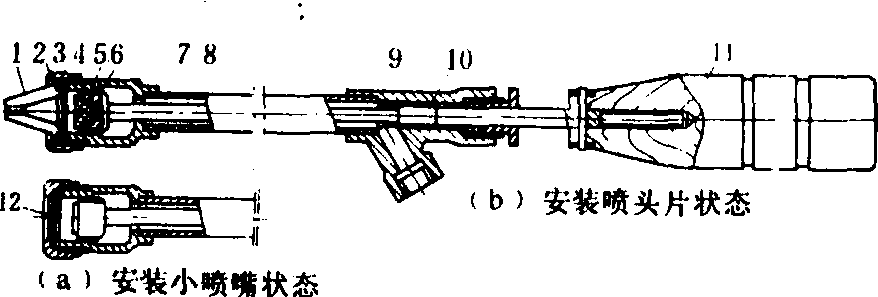 图1 可调喷枪 1. 小喷嘴; 2. 喷嘴帽; 3. 塑料垫圈; 4. 喷头体;5. 关闭塞; 6. 旋水芯; 7. 调节管; 8. 枪管; 9. 三通; 10. 调节杆; 11. 手柄; 12. 喷头片 远射喷枪 结构如图2。喷枪的全长一般为300毫米。喷嘴为单孔式,又称单孔式远射喷枪。孔径规格有2.6、3.0、3.4、3.8及4.2毫米。在零级风及1 500千帕的喷射压力下,其射程为12~17米。作业时,喷嘴喷出的药液与空气撞击而形成雾流,用手指按动装在喷嘴旁的扩散片,以干扰射出的雾流,能使雾流按所需要的方向散射,同时因扩散片与雾流的冲击作用,而使雾滴变小、雾流扩散、射程缩短。单头远射喷枪可与担架式喷雾机配套,适用于水田喷洒。在按动扩散片时,操作者易受到药液的污染。