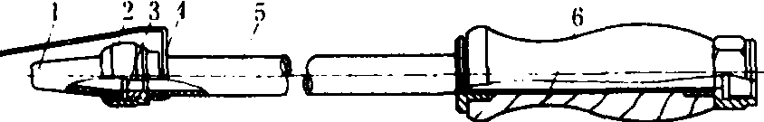 图2 远射喷枪 1. 远射喷嘴; 2. 喷嘴帽; 3. 塑料垫圈; 4. 扩散片;5. 枪管; 6. 木柄 组合喷枪 将2~3个或2~3组不同结构的喷头安装在喷枪上,使其喷出的雾流,按喷射方向,由近到远均匀分布。如在喷枪的端部装有单孔式远射喷头、在喷枪的中部装有狭缝式喷头的双头组合喷枪,喷雾时,均可使两个喷头喷出的雾流,在一个竖直的平面内洒布。在470千帕压力时,喷枪的喷液量每分钟为84升,全射程22米的距离内洒布较均匀。 喷枪spray gun适于远距离喷射的喷雾部件。由喷嘴、喷杆、手柄等组成。喷嘴为单孔式或带有扩散片的单孔式(冲击式)。由喷孔喷出的药液是一种高速射流,受空气阻力击碎而雾化。要使雾滴细,须采用高压和小喷孔,也可在喷嘴旁加扩散片,使药液与扩散片撞击,以加强雾化。还有一种涡流芯可调节的喷枪:当调大涡流芯与喷孔片之间的距离,喷出的雾滴变粗.射程变大;反之,则雾滴较细,射程变小。这种喷头多用于果园病虫害防治,又称果园喷枪。 喷枪spray gun 喷枪spray gun |