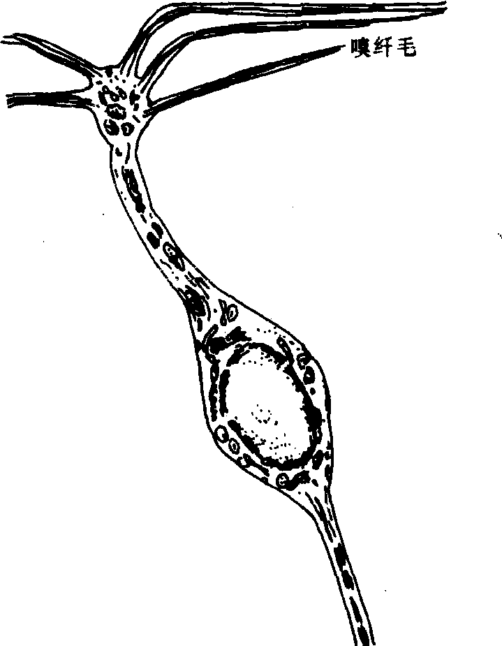 图1.13-8 嗅细胞 ☚ 味觉 皮肤感觉 ☛ 嗅觉olfaction由气体分子刺激化学感受器引起的感觉。嗅觉感受器位于鼻腔上部的嗅上皮,其中的双极细胞是感受细胞,它的嗅纤毛能感受悬浮于气体中的微粒或溶于水及脂肪中的物质的刺激而产生神经冲动。冲动传入中枢神经系统有关中枢,最后引起嗅觉。 嗅觉 嗅觉xiujue由化学气体的刺激所引起的感觉。嗅觉感受器,分布在鼻粘膜上部淡黄色的嗅上皮内,主要由嗅细胞、支持细胞和基底细胞组成。嗅细胞属原始感觉神经细胞,呈杆状,一端伸出几根嗅纤毛伸向嗅粘膜表面的粘液中,另一端变细,为嗅细胞的中枢突。在粘膜内许多神经纤维汇聚,最后集合成约20条嗅丝,穿过筛板上的孔进入颅腔,止于嗅球。气味物质的分子溶解于嗅粘膜表面的液体中,刺激嗅细胞,使其发生兴奋。并产生动作电位。冲动由嗅神经传入各级嗅中枢,最后投射到大脑皮质而产生嗅觉。人的嗅觉敏感度因人而异,同一人的嗅觉敏感度的变动范围也很大。某些疾病、环境的温度、湿度及气压,对嗅觉敏感度也有一定影响。嗅觉还表现有明显的适应性,但不是嗅觉的疲劳。对一种气味适应后,对其他气味仍很敏感。 ☚ 传导性耳聋 味觉 ☛ 嗅觉 嗅觉xiujue辨别气味的感觉。嗅觉的适宜刺激是有气味的物质。其感受细胞是位于鼻腔上部两侧粘膜中的嗅细胞,传导途径为:嗅细胞发放的神经冲动直接传入嗅球,嗅球中的僧帽细胞是嗅觉传导途径中的第二级神经元,它的长突构成嗅束,传入隔区和梨状区。这些部位有神经纤维与边缘系统中的海马、杏仁和扣带回等部位相联系,在大脑皮层上也有与嗅觉功能有关的部位。嗅觉是一种较原始的感觉,许多动物借助于嗅觉来维持生命和传宗接代。 ☚ 听觉发生指标 嗅球 ☛ 嗅觉 嗅觉xiujue有味气体使嗅细胞兴奋引起的感觉(见图)。嗅觉感受器位于鼻腔最上端的嗅粘膜中,嗅粘膜上皮中有嗅细胞,其中的纤维聚集成嗅神经,穿过鼻腔顶部的筛孔进入颅内到达大脑。平静呼吸时,气流通过鼻腔不直达嗅粘膜,有气味物质的空气以回旋式的气流到达嗅粘膜。气味物质分子溶解于嗅粘膜表面的液体中,刺激嗅细胞,使之兴奋,经嗅神经传到大脑皮层有关中枢而产生嗅觉。正常人不仅能辨别200多种不同的气味,而且还对某些气味特别敏感,如每毫升空气中含有4×10-8毫克的人造麝香就能以嗅觉觉察出来。不仅如此,嗅觉还很容易发生适应,“入芝兰之室,久而不闻其香”就是这个原因。如因感冒、鼻炎等疾病造成鼻腔阻塞,就会使嗅觉暂时失灵。