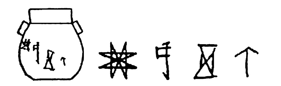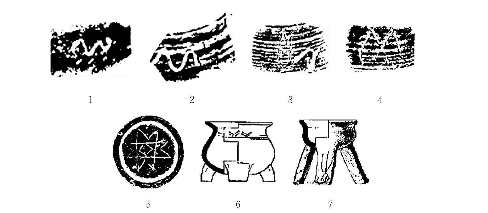 (1-5见《考古学报》1962年第2期第7页图六;6-7见《考古学报》1980年第1期第36页图七) 20世纪70年代后期,江苏澄湖遗址出土了一件黑陶鱼篓形罐,腹部并列4个刻划符号,细若毫发。[1]这4个刻划符号并列刻划,具有早期文字的特征。
