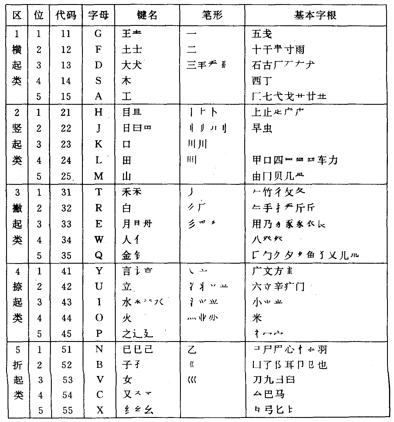 从字根在键盘上的区位分布可以看出,查找字根要注意下面几点: (一)定区:任何字根,第一笔的笔形代码就是它的区号,如下表所示。