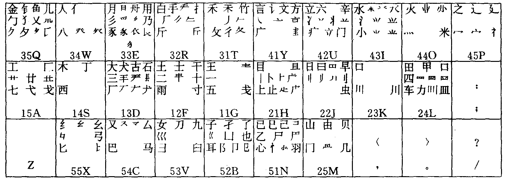 三、字根和字根总表 (一)字根的选取 字根并不象汉字那样,有公认的标准和一定的数量。哪些结构算字根,哪些结构不算字根,历来没有严格的界限。不同的研究者,不同的应用目的,其筛选的标准和选定的数量差异很大。 例如我们可以把“里”选作一个字根。但是,也可以把它拆分为“日”和“土”,“甲”和“二”等两个字根。 在汉字拼形编码的研究中,所选字根多数是传统的汉字部首。如,甲、月、水等。由于某种需要,有时也选用一些不是部首的笔画结构作为字根,甚至于硬造出一些字根。如、、、、丹、等。相反,有些虽然是传统部首,但鉴于它们组字很少或者其本身便于拆分成几部分,在制定编码方案时也未必选取,如在《五笔字型》方案中。足、鱼、羊、户等都不选作字根。 在《五笔字型》汉字编码方案中,我们把那些组字频度高(组字能力强),或实用频度高(即组成的字常用)的字根,称作基本字根。共130个。这130个字根中又可分作键名字、笔形和基本字根三种。 (二)字根总表 把优选出的130个基本字根,按照其起笔代码,分为五个大区,再考虑键位设计的需要,每区又分为五个位,命名区号和位号(十位数为区号,个位数为位号),以11~25共二十五个码表示,这样就建立了《五笔字型》汉字编码方案的字根总表。如下表所示。 《五笔字型》汉字编码方案字根总表