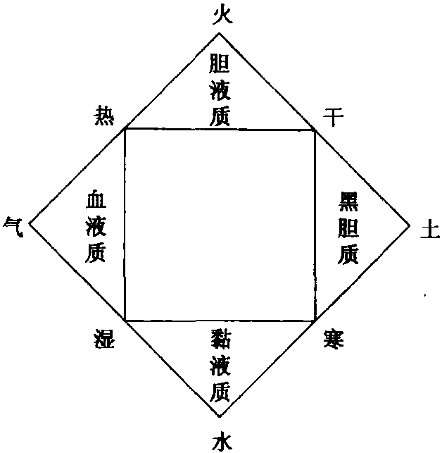 四种体液一般关系图 说明生理功能 四大物质学说以四大物质的全生、全克、半生、半克关系来说明气质和体液本身性属之间的相生、相克的正常的生理状态。 火在生理方面的应用 火(干热性)与火(干热性)的相生是全生关系,火(干热性)与水(湿寒性)的相克是全克关系,火(干热性)与空气(湿热性)的热性,虽然热性生热性是相生关系,但是它的干性又克空气(湿热性)的湿性,而又是生土(干寒性)的干性,故这种特殊的关系称之为半生、半克关系。体液为例,火的性属为干热,它在人体体液中的象征物是胆液质,胆液质(火-干热性)与胆液质(火-干热性)的相生,是全生关系;胆液质(火-干热性)与黏液质(水-湿寒性)的相克,是全克关系;胆液质(火-干热性)的干性一面,相克血液质(空气-湿热性)和黏液质(水-湿寒性)的湿性一面,是半克关系;胆液质(火-干热性)的热性一面,相生血液质(空气-湿热性)的热性一面,是半生关系。 空气在生理方面的应用 空气(湿热性)与空气(湿热性)的相生是全生关系,空气(湿热性)与火(干热性)的相克是全克关系,空气(湿热性)与火(干热性)的热性,虽然热性生热性是相生关系,但是它的湿性又克火(干热性)的干性,而又是生空气(湿热性)的湿性,故这种特殊的关系称之为半生、半克关系。体液为例,空气的性属为湿热,它在人体体液中的象征物是血液质,血液质(空气-湿热性)与空气(湿热性)的相生,是全生关系;血液质(空气-湿热性)与黑胆质(土-干寒性)的相克,是全克关系;空气(湿热性)的湿性一面,相克胆液质(火-干热性)和黑胆质(土-干寒性)的干性一面,是半克关系;血液质(空气-湿热性)的热性一面,相生胆液质(火-干热性)的热性一面,是半生关系。 水在生理方面的应用 水(湿寒性)与水(湿寒性)的相生是全生关系,水(湿寒性)与火(干热性)的相克是全克关系,水(湿寒性)与土(干寒性)的寒性一面,虽然寒性生寒性是相生关系,但是它的湿性又克火(干热性)的干性,而又是生土(干寒性)的寒性,故这种特殊的关系称之为半生、半克关系。体液为例,水的性属为湿寒,它在人体体液中的象征物是黏液质,黏液质(水-湿寒性)与黏液质(水-湿寒性)的相生,是全生关系;黏液质(水-湿寒性)与胆液质(火-干热性)的相克,是全克关系;黏液质(水-湿寒性)的湿性一面,相克黑胆质(土-干寒性)和胆液质(火-干热性)的干性一面,是半克关系;黏液质(水-湿寒性)的寒性一面,相生黑胆质(土-干寒性)的寒性一面,是半生关系等。 土在生理方面的应用 土(干寒性)与土(干寒性)的相生是全生关系,土(干寒性)与空气(湿热性)的相克是全克关系,土(干寒性)与水(湿寒性)的寒性,虽然寒性生寒性是相生关系,但是它的干性又克空气(湿热性)的湿性,而又是生水(湿寒性)的寒性,故这种特殊的关系称之为半生、半克关系。体液为例,土的性属为干寒,它在人体体液中的象征物是黑胆质,黑胆质(土-干寒性)与黑胆质(土-干寒性)的相生,是全生关系;黑胆质(土-干寒性)与血液质(空气-湿热性)的相克,是全克关系;黑胆质(土-干寒性)的干性一面,相克血液质(空气-湿热性)和黏液质(水-湿寒性)的湿性一面,是半克关系;黑胆质(土-干寒性)的寒性一面,相生黏液质(水-湿寒性)的寒性一面,是半生关系。 说明病理变化 四大物质学说以四大物质的过生、过克、过半生、过半克的关系来说明气质和体液本身性属之间的相乘和相侮的异常病理状态。 四大物质学说中的“相乘”和“相侮”,实际上是反常情况下的“相克”现象,维吾尔医药学中用以此解释病理现象。所谓“相乘”,是指四大物质中的某一种某一个物质本身不足(衰弱),使原来克它的一个乘虚侵袭,而使它更不足。如:火原来是克水的或水原来是克火的,但是由于本身的不足,火即乘水的虚而克它或水即乘火的虚而克它,等等。 疾病的发生维吾尔医药学认为,人体是一个有机的整体,因而当某一种体液失调时,也会直接和间接地影响其他体液的正常功能,从而发生疾病。其变化规律,可以应用四大物质乘侮来解释。如:火(干热性)胆失调(偏盛或偏低)时,可直接地影响黏液质和间接的影响黑胆质的正常功能,等等。其他体液也可以依次推理,不作一一详述。但仅应用四大物质的生克乘侮来解释全部病理变化还很不够,需要进一步完善它朴素的逻辑推理。 用于疾病的诊断 维吾尔医学通过四诊所得材料,并根据四大物质的生克乘侮规律来诊断疾病,如:面色苍白、形体肥胖、肌肉松软、性情沉静、动作迟缓、嗜睡、小便清长、舌苔白、脉迟等便考虑到黏液质(湿寒)偏盛,水患为病。面赤目黄,形体消瘦,肌肉坚硬,烦躁易怒,动作迅猛,少寐,小便赤黄,舌质红,苔黄,脉数等便考虑到胆汁质(干热)偏盛,火患为病等等。治疗时也是如此,除了调节引起病变的体液以外,还应考虑其他有关的体液,并调整其关系,掌握其转变,以达到治疗的目的。如:胆汁质(火)偏盛的疾病可通过生克乘侮,影响其他体液,而其他体液的变化也可以导致胆液质变化的疾病。 用于疾病的治疗 在维吾尔医学治则治法中,有很多治疗原则和方法是根据四大物质的生克乘侮规律确立的。如:壮水制火法等等。在此不作一一详述。但应当指出,根据四大物质相生、相克而确定治疗原则,有一定的局限性,因此对于辩证立法,应以四体液之间的内在联系和相互影响,从具体病性出发,而不应受四大物质生克理论的局限。 ☚ 四大物质学说的基本内容 气质(