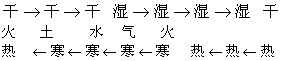 大物质的“相生”、“相克”是指火、气、水、土物质之间存在的相互滋生(相生)和相互制约(相克)的关系。 维吾尔族人的四大物质学说中,四大物质的性属因由两个不同的性质混合组成,故它们之间存在与众不同的独特和特殊的全生、全克、半生、半克和过生、过克、过半生、过半克的关系。 四大物质的“相生”程序
