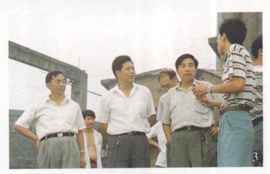 4.四川省交通厅副厅长刘晓峰(左二)、省交通厅航务管理局局长刘龙铸(左三)在乐山肖坝大件码头工地研究港口建设。 |