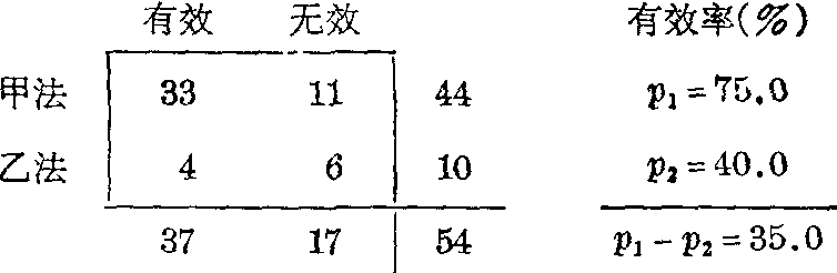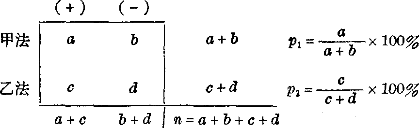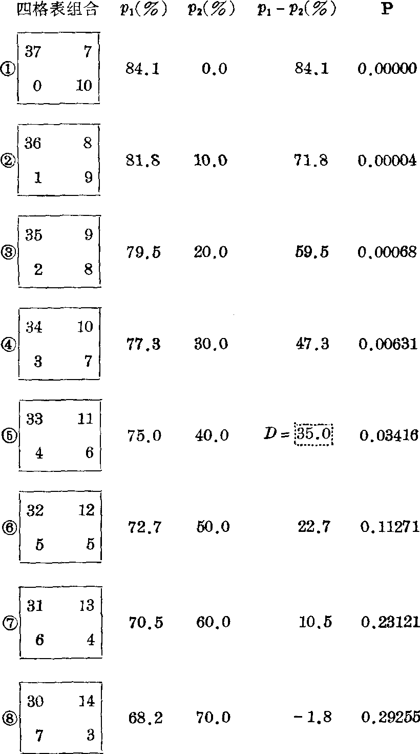 (1) 单侧检验: H0:甲法有效率等于乙法, H1:甲法有效率高于乙法。 α=0.05。取p1-p2≥35.0%的各组合之P值和,即第 ❶、 ❷、 ❸、 ❹、 ❺组合P值之和: P=0.00000+0.00004+0.00068+0.00631+0.03416=0.04119, 按α=0.05水准拒绝H0,接受H1,故认为甲法有效率高于乙法。 (2) 双侧检验: H0:甲法有效率等于乙法, H1:甲法有效率不等于乙法。 α=0.05。 取|p1-p2|≥35.0%的各组合之P值和,即第 ❶、 ❷、 ❸、 ❹、 ❺、(11)组合P值之和: P=0.04119+0.01456=0.05575。 按α=0.05水准不拒绝H0,故尚不能认为甲乙两法的有效率不同。查表法 由于本法计算较繁,已制成多种工具表备查,如由后列参考书可直接查出两样本含量均不超过50或两样本阳性数之和及阴性数之和均不超过50的范围内所有组合之单侧检验和双侧检验界值,各包括α=0.05和α=0.01两种水准。 递推法 在四格表各组合的序列中,当按式(1)求得任一组合的概率后,可按式(2)或式(3)的递推公式,求出相邻组合的概率,并递推出所有组合的概率: