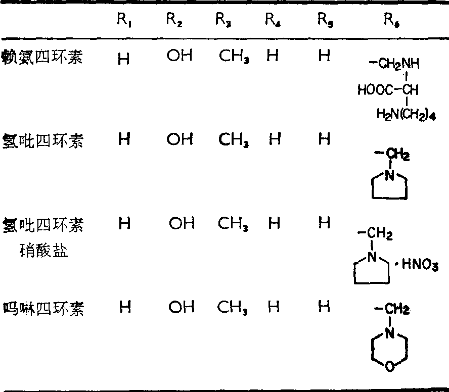 均为黄~深黄色结晶形粉末,弱碱性,无臭,味苦,在空气中稳定,水溶性差,其盐酸盐水溶性较好。 四环素族抗生素对革兰阳性和阴性细菌均具抑制作用,在革兰阳性菌中敏感的有肺炎球菌、溶血性链球菌、草绿色链球菌、部分葡萄球菌、炭疽杆菌、破伤风杆菌、梭状芽胞杆菌等,但对四环素族易产生耐药性。在革兰阴性细菌中,四环素族对多数肠杆菌属,如大肠杆菌、产气杆菌、肺炎杆菌、流感杆菌、奈瑟菌、百日喉、布氏杆菌等都敏感,四环素族对衣原体、支原体、各种立克次体、螺旋体、放线菌、某些原虫等也具有抑制作用。沙门菌和痢疾杆菌菌株在体外试验中对之大多数敏感,但临床应用效果常不满意; 而变形杆菌和绿脓杆菌菌株对四环素敏感性差异甚大,大多耐药。各种四环素族抗生素在体内外对微生物的作用均相似,但不完全相同,不可贸然相互替代,临床应用时,应尽可能根据药敏测定的结果加以选择。 细菌对各种四环素族抗生素有交叉耐药性,但某些耐药金黄色葡萄球菌对二甲胺四环素与去氧土霉素常仍敏感。 四环素族的抗菌作用主要在于抑制细菌生长,但在较高浓度时也具有杀菌作用。四环素族抗生素能特异地和核糖体30S亚基的A位置相结合,阻止氨基酰~tRNA在该位置上的连接,因而阻断了蛋白质的合成。 长期大量应用四环素类抗生素会导致二重感染 (菌群交替症),所引起的真菌病,以白色念珠菌为多,常见者为消化道感染,口腔鹅口疮,也可侵入血液造成全身性感染或伪膜性肠炎。此外也可引起各种金黄色葡萄球菌感染或葡萄球菌肠炎。 四环素类抗生素,沉积于某些组织、骨胳、牙齿内,造成龋齿,染色由黄转为深黄直接引起釉质发育不全。国外早有规定禁止用于儿童。我国卫生部1982年决定对7岁前小儿及围产期,授乳期妇女禁止使用四环素类抗生素。四环素类抗生素有光敏反应,表现为感光性皮炎,其中以去甲金霉素更为多见。 临床常用的四环素、土霉素等均另立条目,下述四环素衍生物,已开始临床试用。 赖氨四环素(lymecycline) 水溶性好,临床用于400例由于嗜血杆菌引起的肠道炎,效果很好。副作用有胃肠道障碍。剂量为每天600mg。 氢吡四环素(rolitetracycline) 水溶性好,几近中性,故不刺激组织,宜于注射给药,血浓度为四环素的两倍以上。剂量: 肌内注射150mg/8~12h。静脉注射350~750mg/12h。 氢吡四环素硝酸盐(rolitetracycline nitrate) 水溶性好,作注射用。血浓度高,应用范围同四环素。剂量: 肌内注射200~300mg/d,静脉注射0.5~1g/d。 吗啉四环素(morphocycline) 水溶性好,作注射用,血浓度高,与氯霉素合用有协同作用,使用时应注意肾功能情况。有血栓静脉炎患者禁用。高血压患者、有心肌梗塞史患者、孕妇慎用。副作用: 眩晕、心搏过速、动脉压升高。剂量: 静脉注射0.1~0.15g/d。 上述四环素衍生物的R取代基如下: