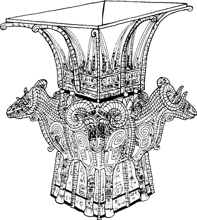 盛酒器,作于商代后期,1938年湖南宁乡月山铺转耳仑出土。尊呈方形侈口, 通高58.3、口径52.4×52.4厘米。该尊通体遍布精美细致的多种纹饰。颈部饰蕉叶形相对龙纹,尊四面肩部中央各有一突出带角的龙头, 肩之四角各饰一突出的大角羊, 羊头上有卷曲的巨大双角, 耳甚小, 向上竖起作静听状。两眼微微凸起。口、鼻悉备, 蹄足分明。腿上部饰凤纹。尊之边缘处均饰有出戟的扉棱。古代的匠师们把装饰纹样、动物形象与整个器形的结合巧妙,和谐得体,不愧为光辉灿烂的商代青铜文化的杰作。