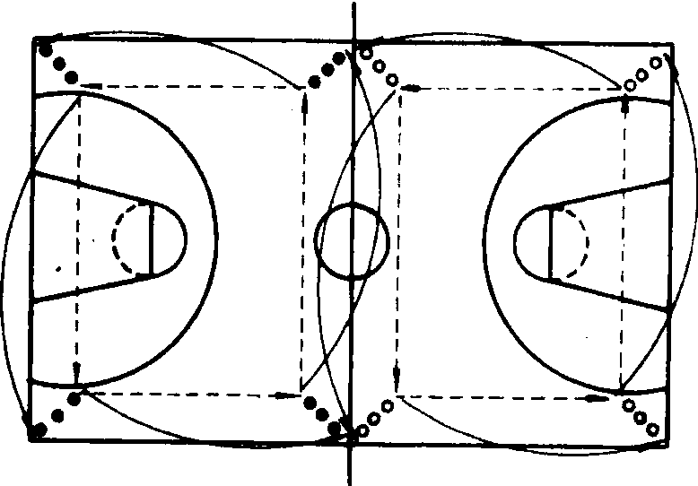 游戏方法 将学生分成人数相等的甲乙两队, 各占半场,每队平均分为4组,各组成一路纵队分别在本队半场上,排头面向中间站好。其中一组排头持球。教师发出口令后比赛开始,两队同时进行,持球者将球沿逆时针方向传给第二组排头,传出球后,迅速跑到第二组队尾站好,第二组排头接球后将球向下一组传去,并迅速跑到下一组排尾,以此连续进行传球。每次传出球后,全队喊出连续传球的次数,当教师再发口令时,接到球的学生立即沿顺时针方向传球并跑动。在规定时间内以连续传球次数多者为胜。