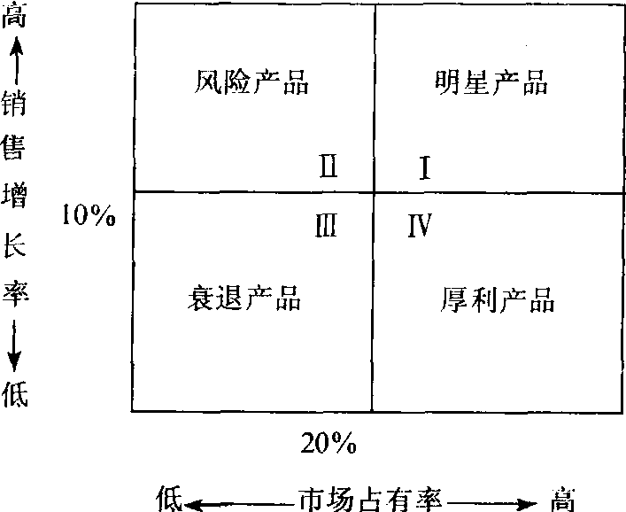 | 释义 | 四象限评价法 四象限评价法亦称“波士顿矩阵评价法”。利用产品的市场占有率和销售增长率两个指标对产品进行评价,并据以制定产品经营对策的方法。其应用步骤如下: (1) 以销售增长率为纵坐标,市场占有率为横坐标,作四象限图 (如下图如示); (2) 收集企业各种产品的销售增长率和市场占有率资料,并在四象限图中找到所对应的位置,即属于哪一个象限;(3) 根据产品在四象限图中所处的位置,结合市场调查和预测,分别制定各产品相应的经营对策。一般来说,对处于第Ⅰ象限的“明星产品”,应大量投资发展; 对处于第Ⅱ象限的“风险产品”,如果投资发展,务必慎重; 对处于第Ⅲ象限的“衰退产品”,应尽快淘汰; 对处于第Ⅳ象限的“厚利产品”,应努力维持和扩大销售,争取更多盈利。