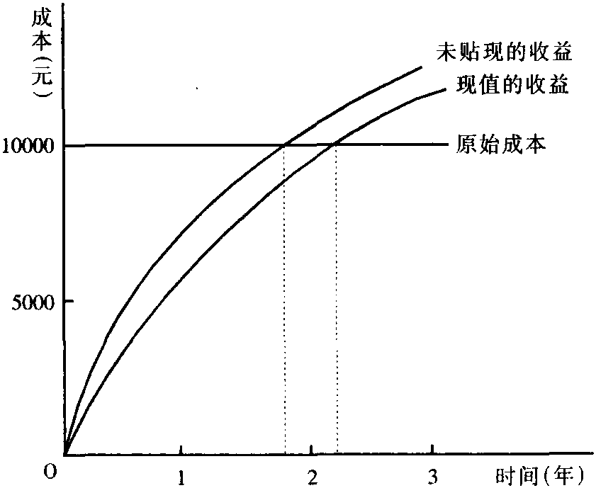 如图所示,假如某方案的原始成本为1万元。根据未贴现的收益曲线,第1年末的收益流量为6440元,第2年末为10880元,第3年末为13320元,因此回收期大约为1.8年。若考虑货币的时间价值,也就是根据现值的收益流量确定回收期,3个年末的收益的现值分别为5853元、9521元和12105元,表明回收期应为2.18年。